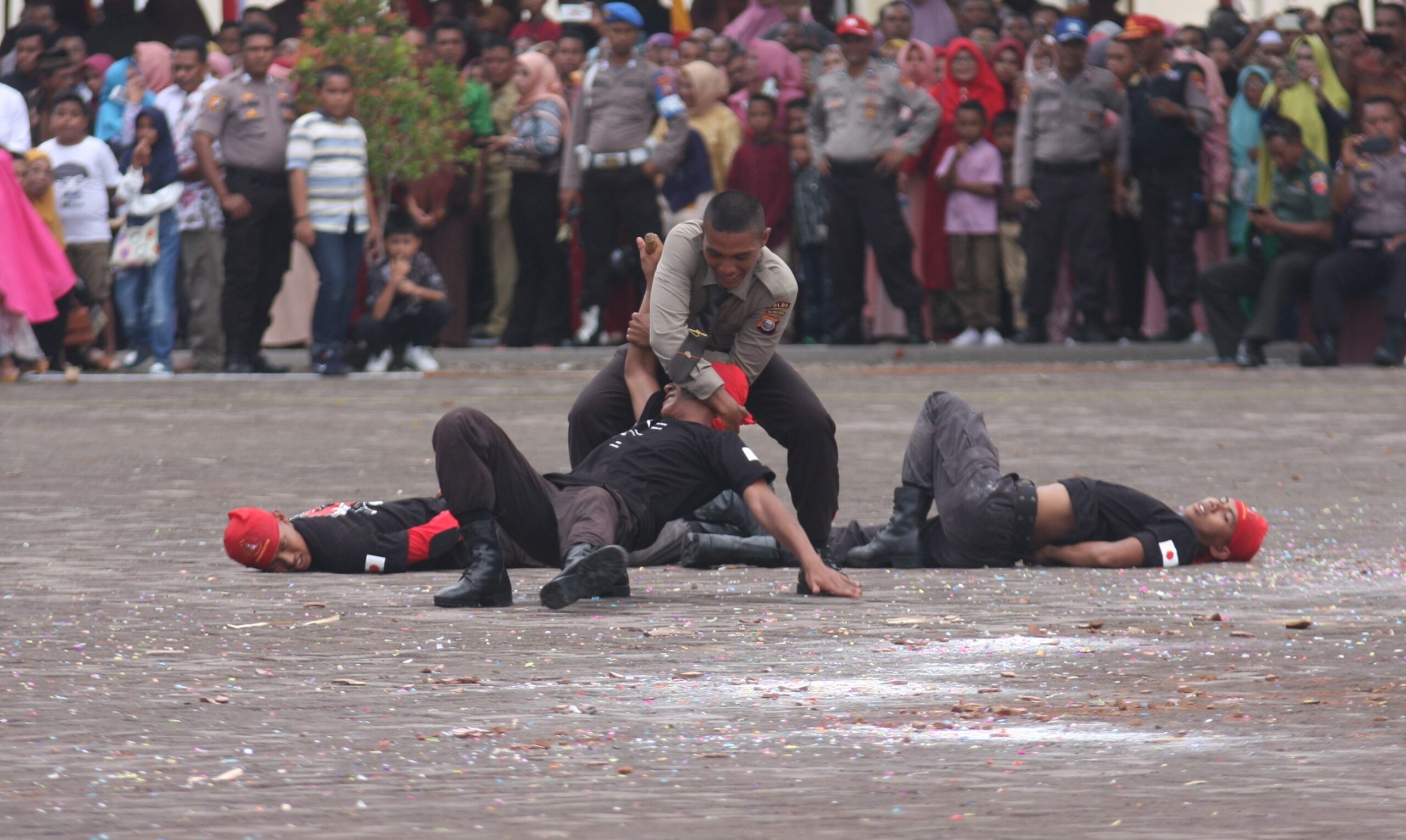Para siswa yang baru dilantik sebagai Bintara Polri melakukan berbabagi atraksi di sela-sela upacara penutupan pendidikan dan pelatihan calon Bintara Polri angkatan 44 di Sekolah Polisi Negara (SPN) Polda Maluku Utara di Sofifi, kemarin (2/3). FOTO PHOER/HARIAN HALMAHERA