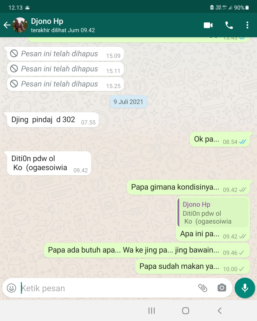 Keesokan harinya, pukul 08.00 masih kirim WA lagi. Tapi sudah tidak bisa diketahui apa maksudnya. Kalimatnya tidak jelas. Harry kesulitan membaca pesan itu.