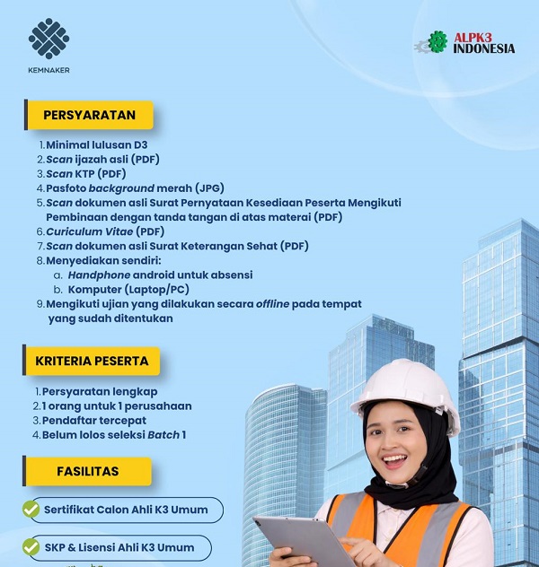 HARIANHALMAHERA.COM– setelah sukses menyelenggarakan batch I, Kementerian Ketenagakerjaan (Kemnaker) kembali membuka program Pembinaan dan Sertifikasi Ahli Keselamatan dan Kesehatan Kerja (K3) Umum Batch 2 dengan kuota 2.100 peserta dari seluruh Indonesia. Pendaftaran dibuka pada 6–12 April 2026.